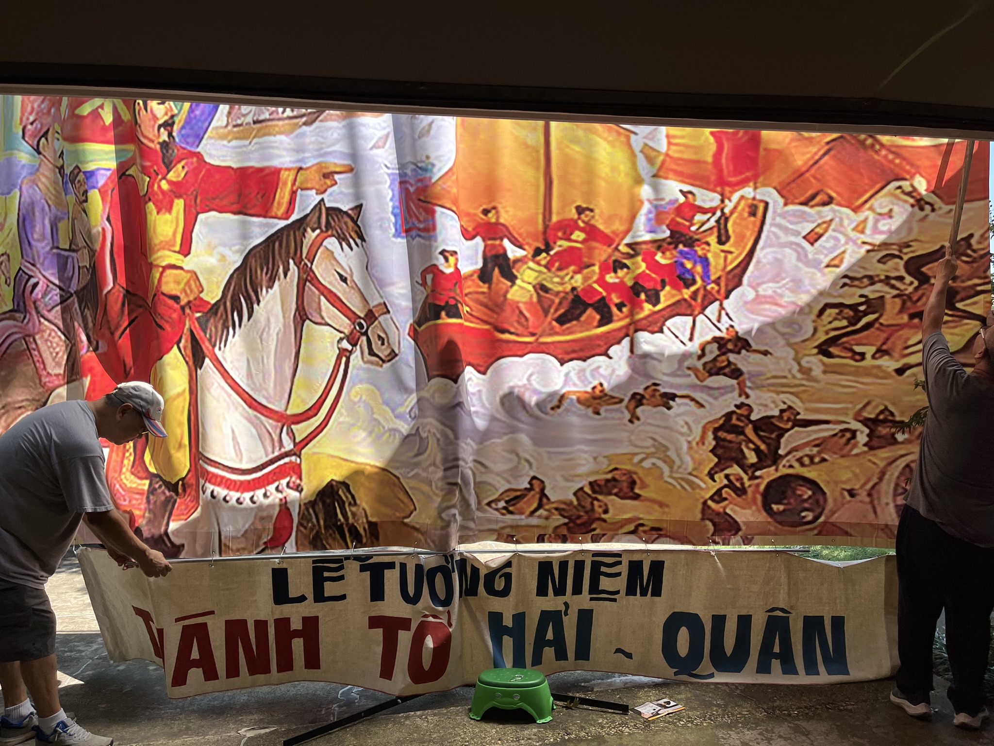 Các hậu duệ Hải Quân Việt Nam Cộng Hòa, Trừ Bị Thủ Đức, và Võ Bị Đà Lạt chuẩn bị khung trang trí trên sân khấu