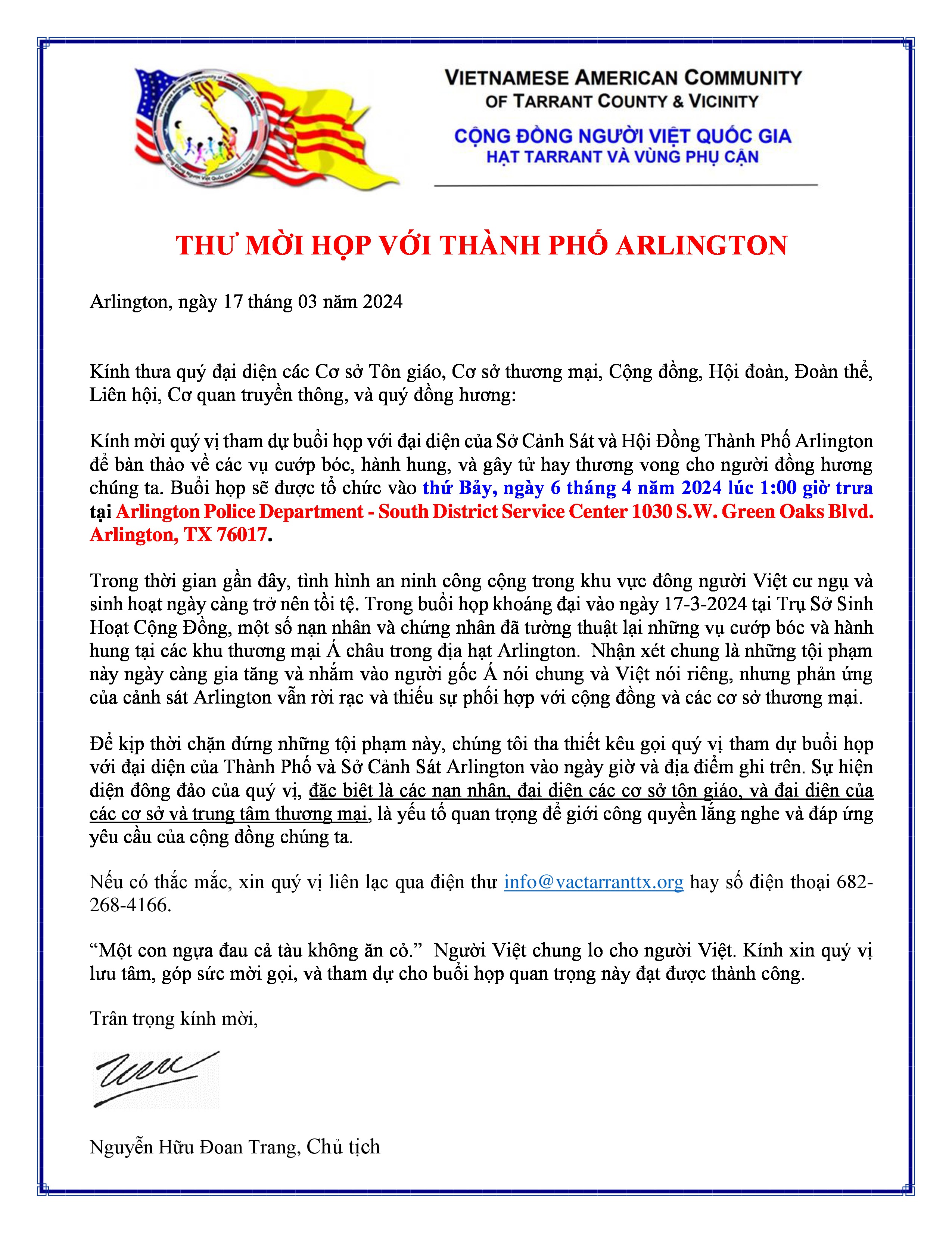 Thư Mời Họp với Cảnh Sát Thành Phố Arlington, Texas, của Cộng Đồng Người Việt Quốc Gia Hạt Tarrant