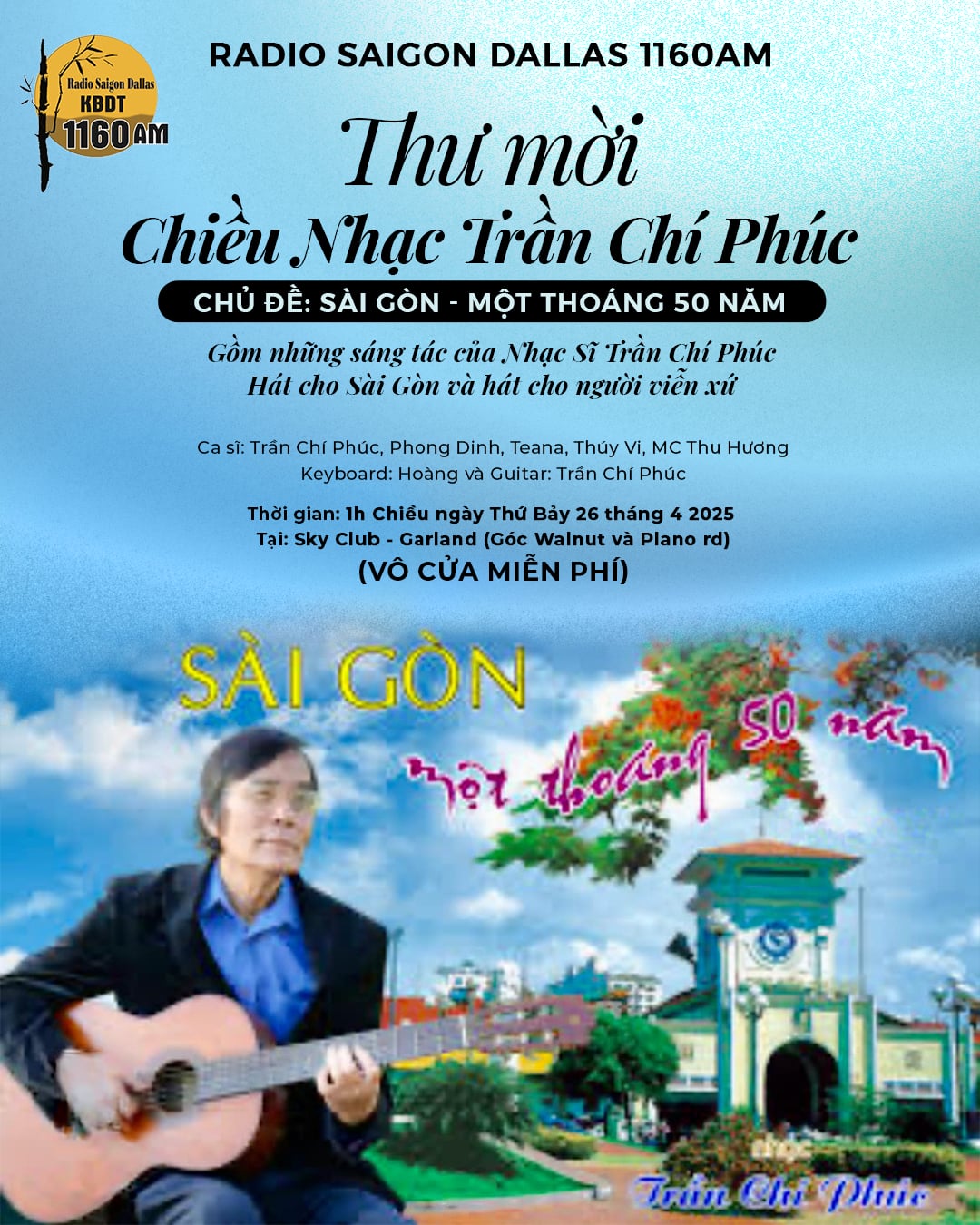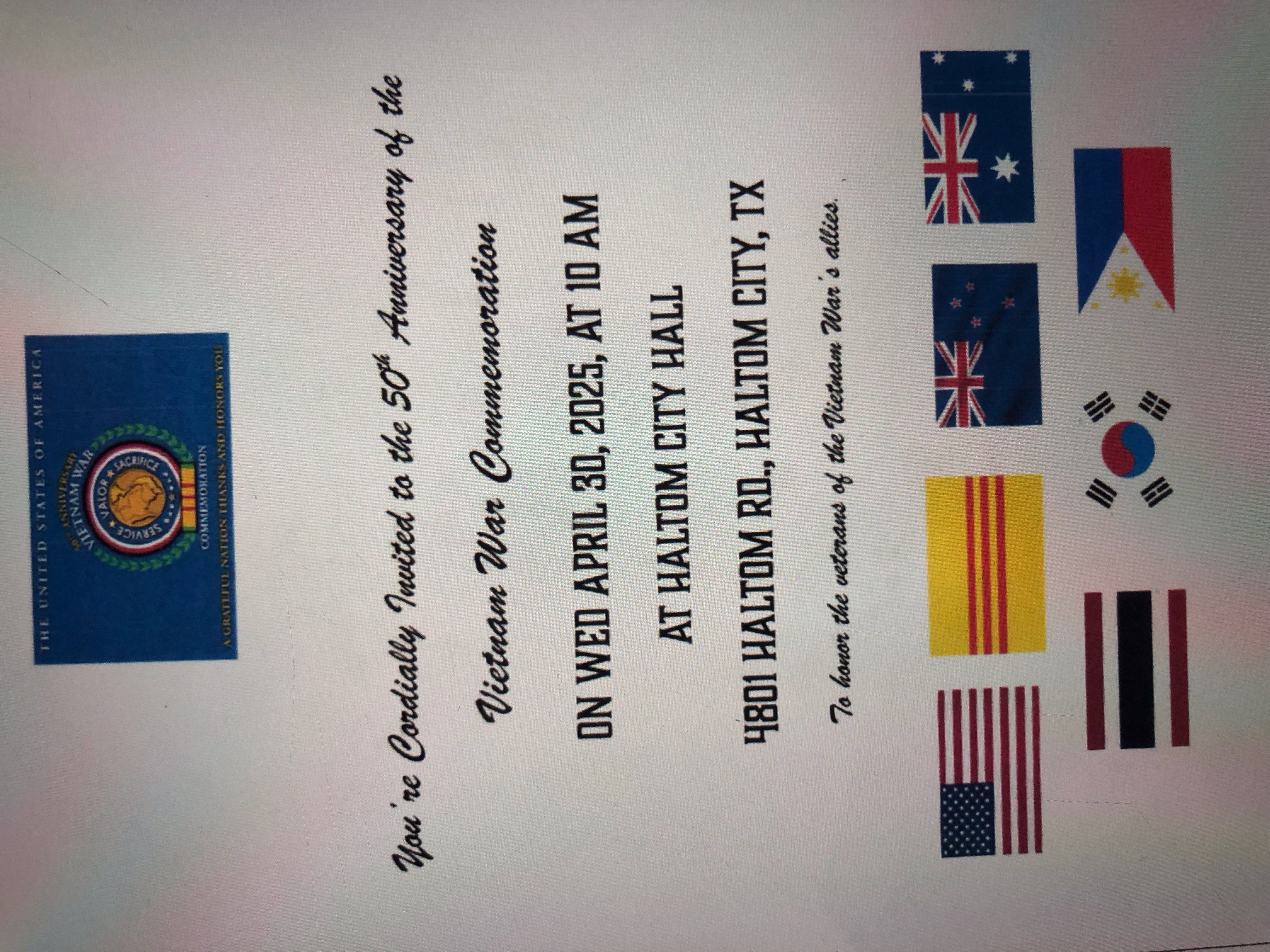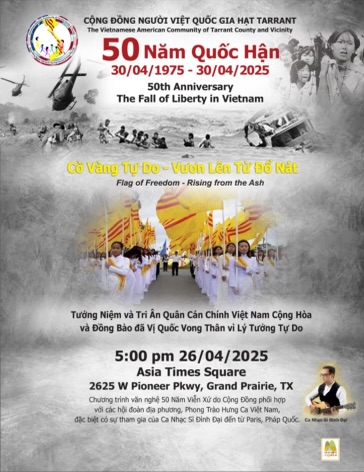 Quốc hận lần thứ 50 lại đến trong niềm đau và xót xa của cộng đồng Người Việt hải ngoại. Cộng Đồng Người Việt Quốc Gia (CĐNVQG) Dallas cùng các Hội Đoàn và Đoàn Thể tại địa phương sau các phiên họp đã đồng thuận phối hợp hình thức tổ chức Lễ Tưởng Niệm Quốc Hận 30-4 năm nay vào ngày Chủ Nhật 27 tháng 4 năm 2025 theo chương trình như sau: