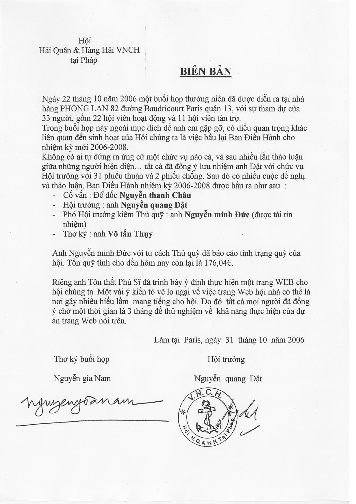 Biên Bản buổi họp ngày 31 tháng 10 năm 2006 của Hội HQHH/VNCH tại Paris, Pháp