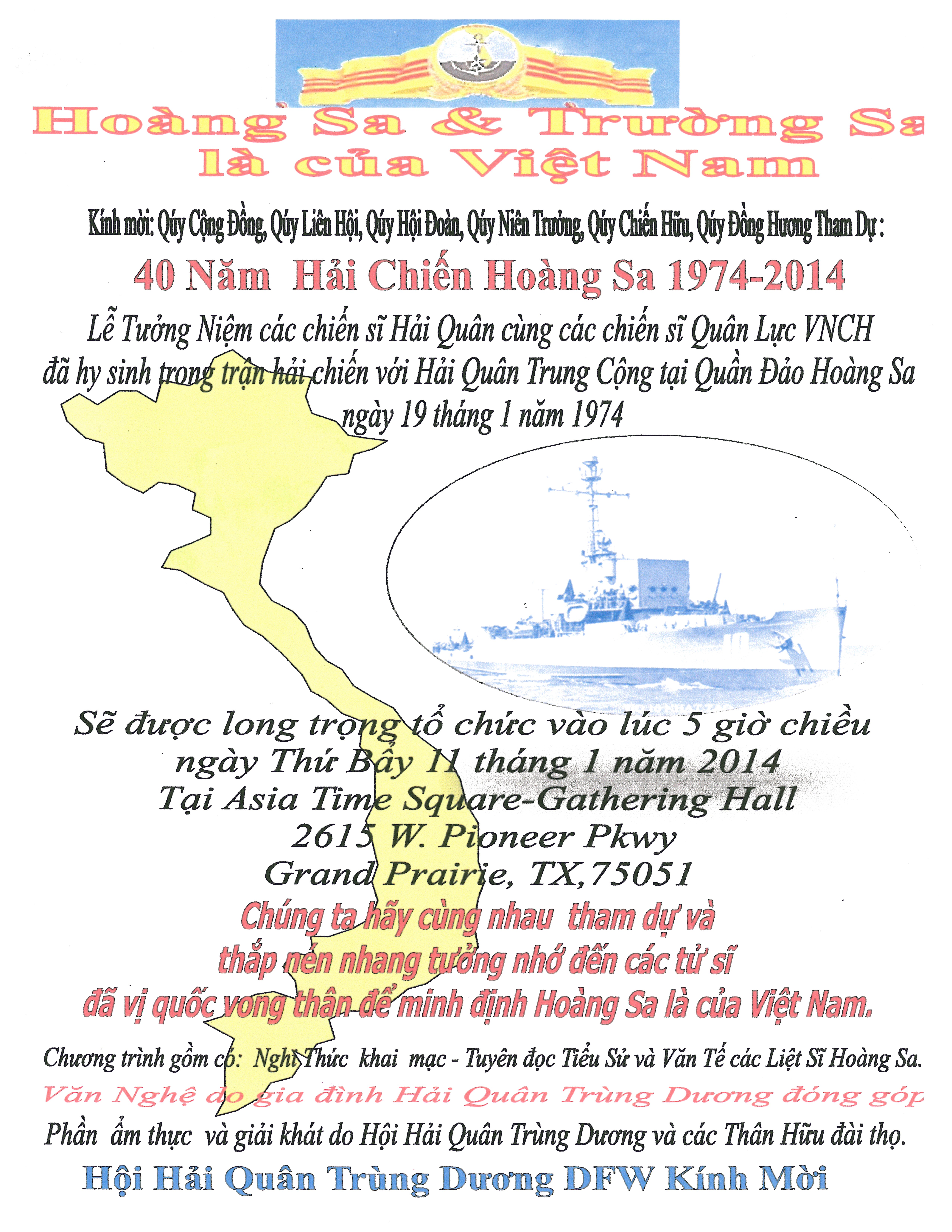 LỄ TƯỞNG NIỆM 40 NĂM HẢI CHIẾN HOÀNG SA VÀ 74 TỬ SĨ VIỆT NAM CỘNG HOÀ ĐÃ ANH DŨNG HY SINH TRONG CHIẾN ĐẤU BẢO VỆ BIỂN ĐẢO, DO HỘI HẢI QUÂN VÀ HÀNG HẢI VNCH MIỀN ĐÔNG HOA KỲ TỔ CHỨC