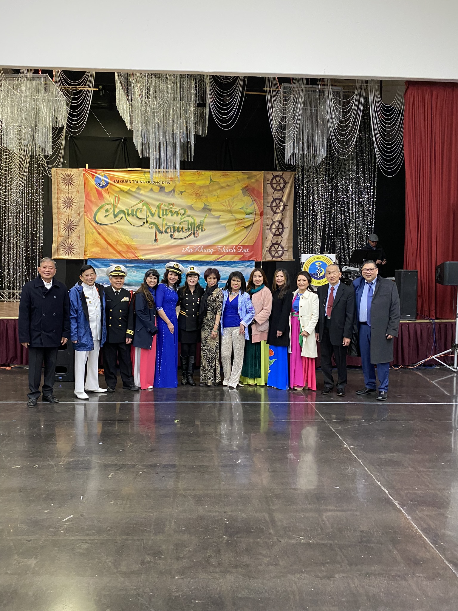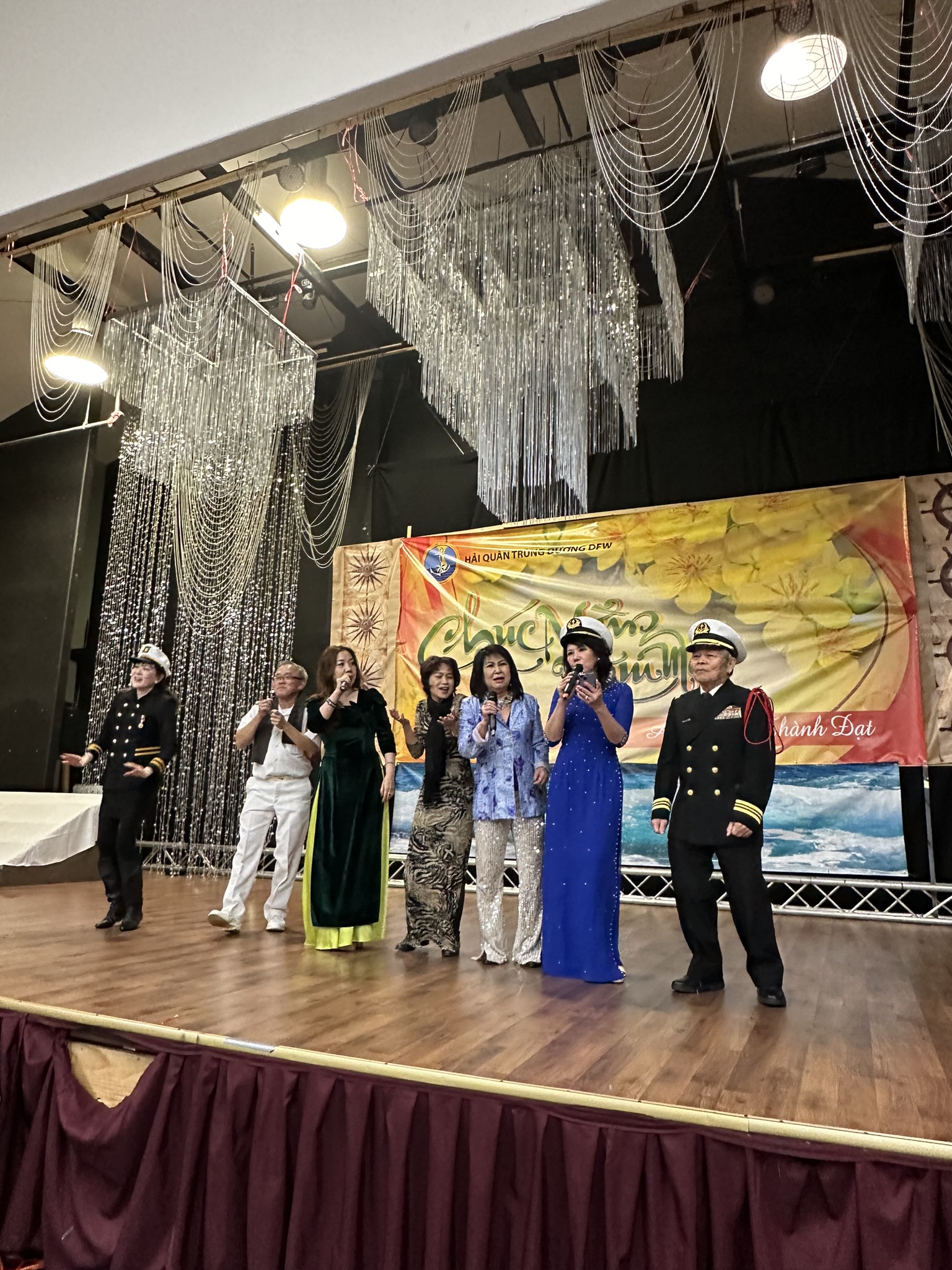 Từ trái qua phải: Chiến hữu Nguyễn Hữu Tường, Chiến hữu Nguyễn Văn Nở, HQ Thiếu Tá Trần Đỗ Cẩm (Khóa 11/Austin, Texas), Ca Sĩ Hoàng Lan (Nhóm Thiện Nguyện Hoàng Lan), Nguyễn Thục Huyền {Hậu duệ của cố HQ Trung Tá Nguyễn Trần Hùng (Khóa 6)}, Nhã-Ánh (gia đình Hải Quân Trùng Dương Dallas-Fort Worth), Cô Vân-Anh (Thủ Quỹ, Cộng Đồng Người Việt Quốc Gia Tarrant County), Bà Nguyễn Hữu Đoan Trang (Chủ Tịch, Cộng Đồng Người Việt Quốc Gia Tarrant County), Ca Sĩ Thu Hương (Hội Trưởng Hội Ái Hữu Bình Định Dallas-Fort Worth), Nguyễn Trác Phương (gia đình Hải Quân Trùng Dương Dallas-Fort Worth), Trưởng Ban Văn Nghệ Nguyễn Thanh Hằng (gia đình Hải Quân Trùng Dương Dallas-Fort Worth), Hà Mạnh Chí {hậu duệ của HQ Đại Tá Hà Văn Ngạc (1935-1999, Khóa 5)}, và Nguyễn Tiến Lễ {hậu duệ của HQ Đại Tá Nguyễn Trọng Hiệp (1934-2022, Khóa 5)}