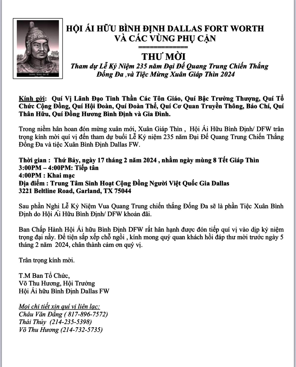 Trân trọng kính mời Ông đến tham dự buổi Lễ Kỷ niệm 235 năm Đại Đế Quang Trung Chiến Thắng Đống Đa và Tiệc Xuân Bình Định Dallas FW.
