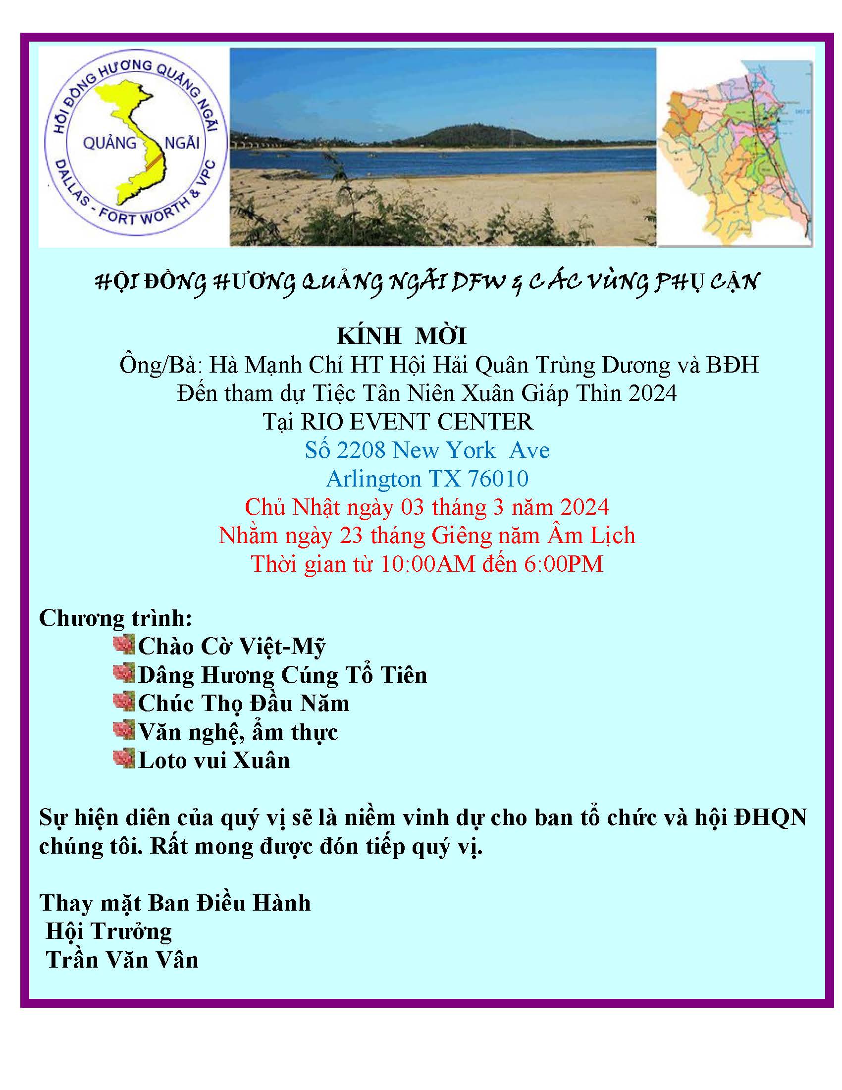 Trân trọng kính mời Gia Đình Hải Quân Trùng Dương Dallas-Fort Worth & Vùng Phụ Cận đến dùng bát phở Tình Thương nóng ngon cùng chung vui với các Bác cao niên, và thưởng thức chương trình văn nghệ mừng Xuân Giáp Thìn 2024.