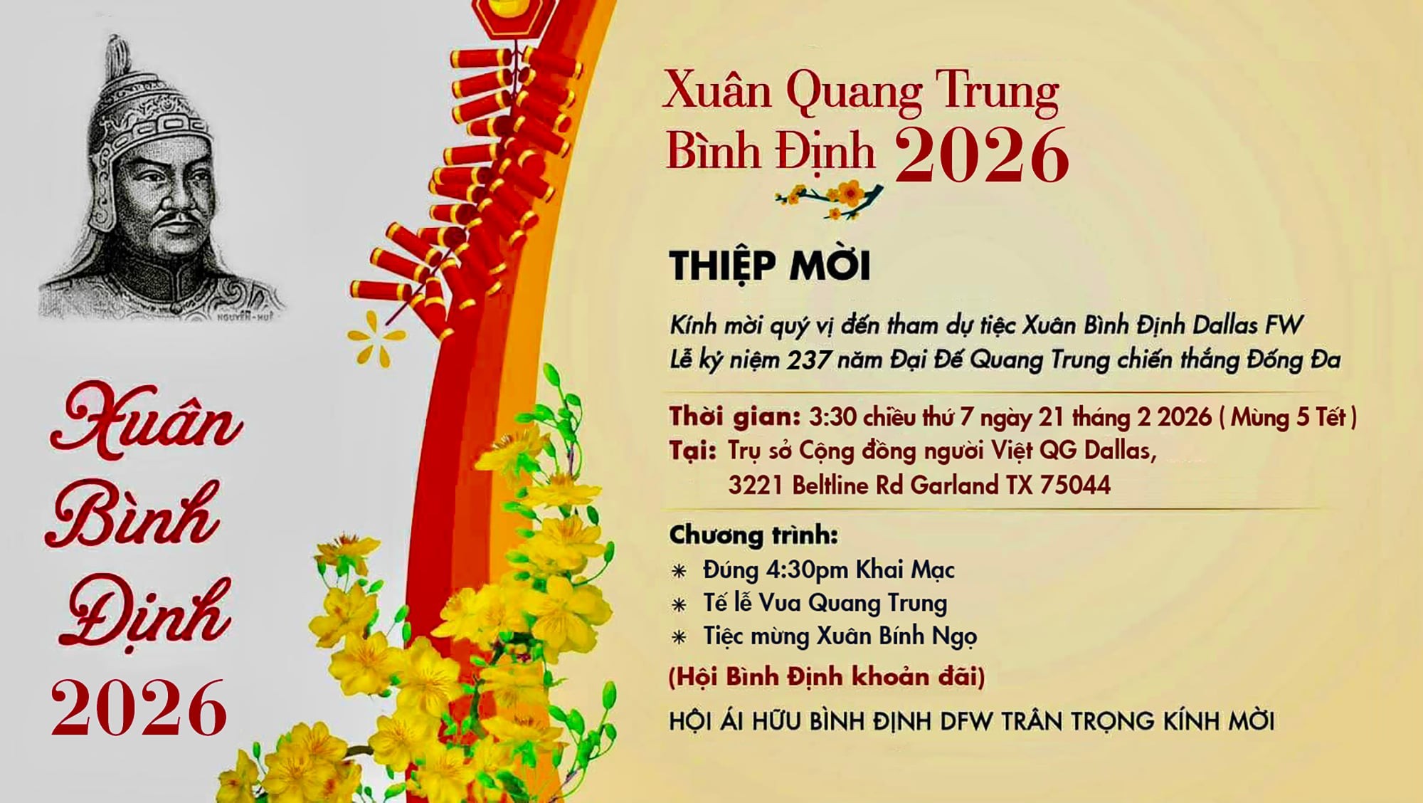 Thư mời tham dự Tiệc Xuân Quang Trung Bình Định 2026/ 3:30h chiều Thứ Bảy Feb 21 (Mùng 5 Tết )