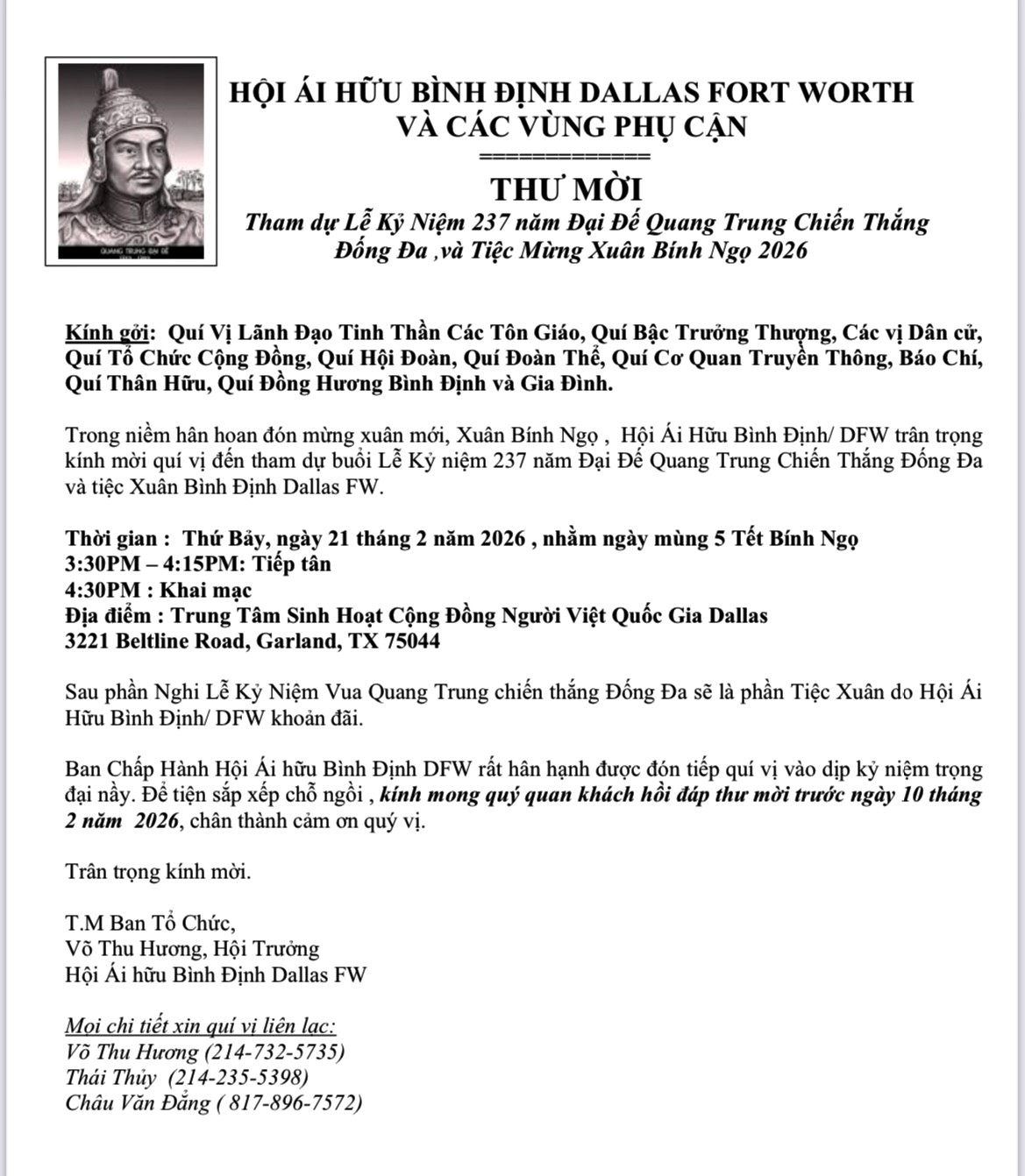 Trân trọng kính mời Anh Hà Mạnh Chí đến tham dự buổi Lễ Kỷ niệm 237 năm Đại Đế Quang Trung Chiến Thắng Đống Đa và Tiệc Xuân Bình Định Dallas-Fort Worth (DFW).