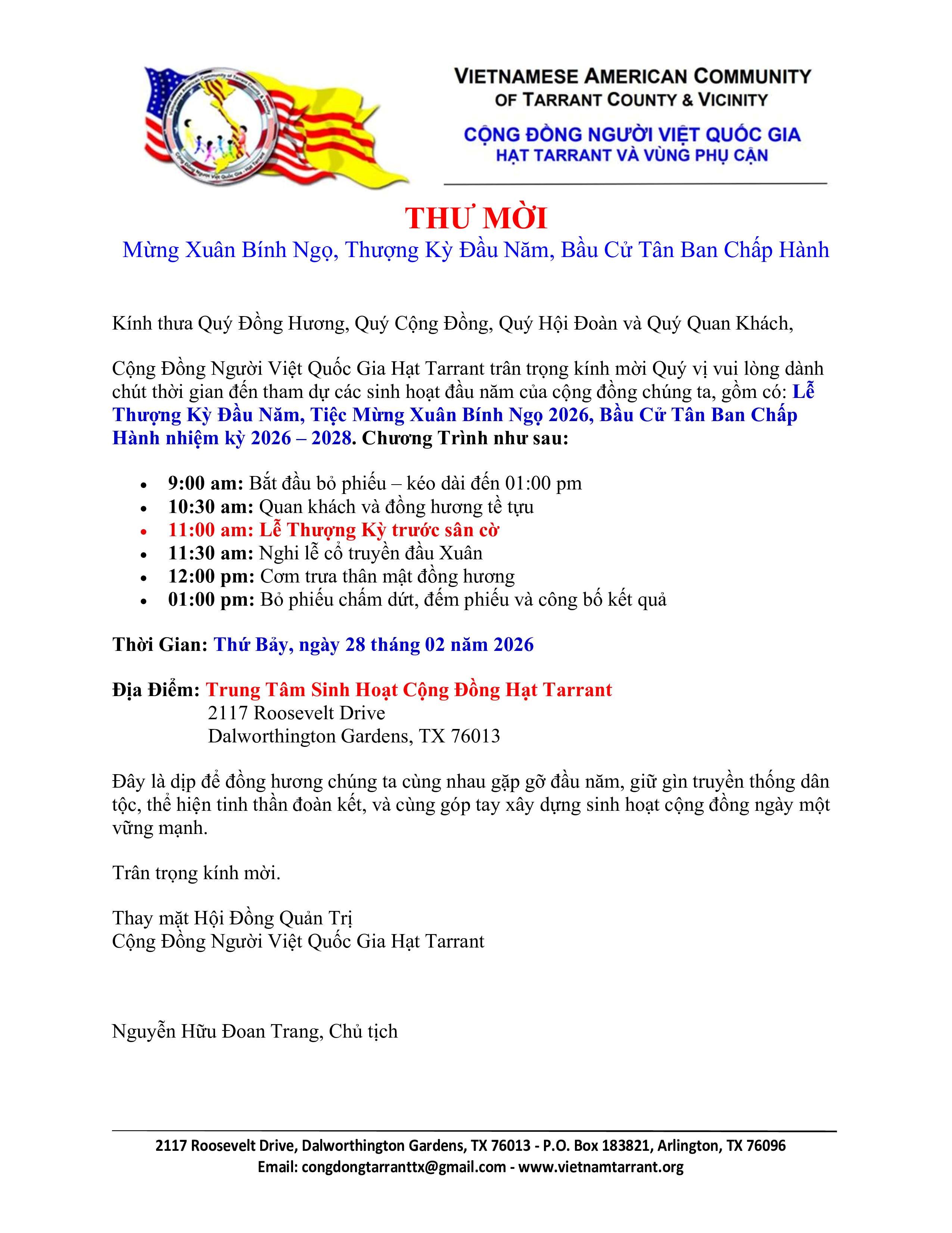 Hội Đồng Quản Trị Cộng Đồng Người Việt Quốc Gia Dallas trân trọng kính mời quý vị đến tham dự chương trình Mừng Xuân Bính Ngọ 2026. Đặc biệt, vào lúc 12:00 trưa Chủ Nhật ngày 1 tháng 2, sau nghi thức chào cờ, múa lân và đốt pháo, Ban Tổ Chức sẽ giới thiệu đại diện các cộng đồng bạn, các hội đoàn cùng quý vị khách mời danh dự để có đôi lời chúc Xuân gửi đến toàn thể đồng hương.