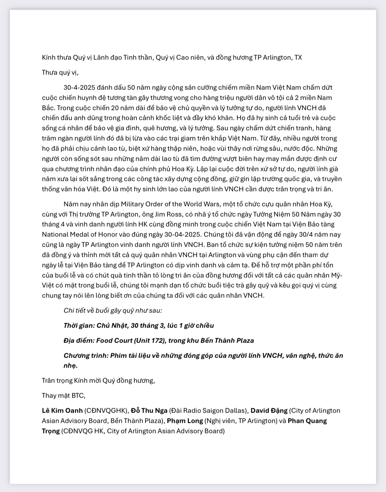 Trân trọng kính mời toàn thể quý vị đến tham dự phiên họp khoáng đại về Tưởng Niệm Quốc Hận 30 Tháng 4 Lần Thứ 50, vào lúc 9:30 sáng ngày 23 tháng 3 năm 2025,