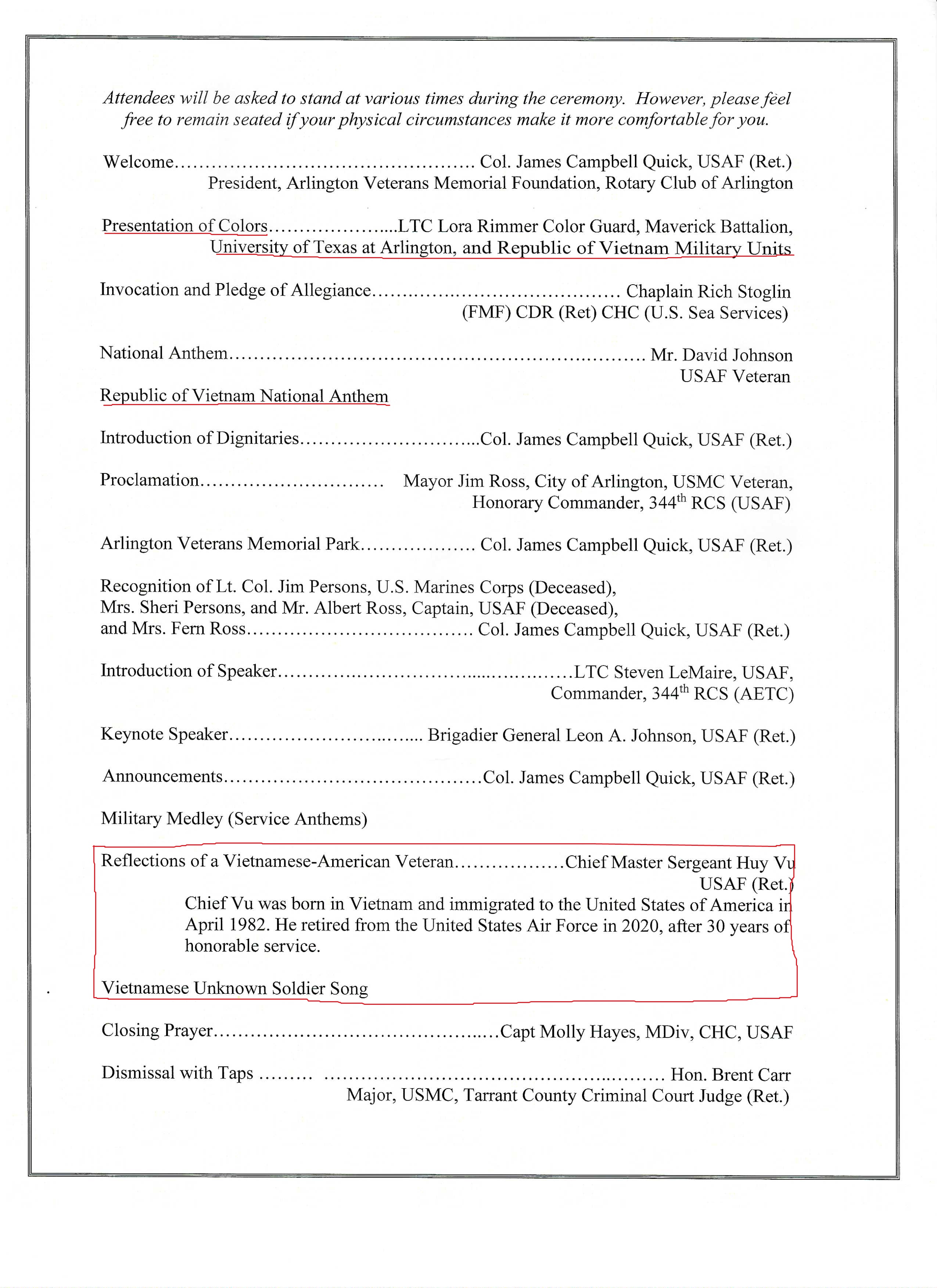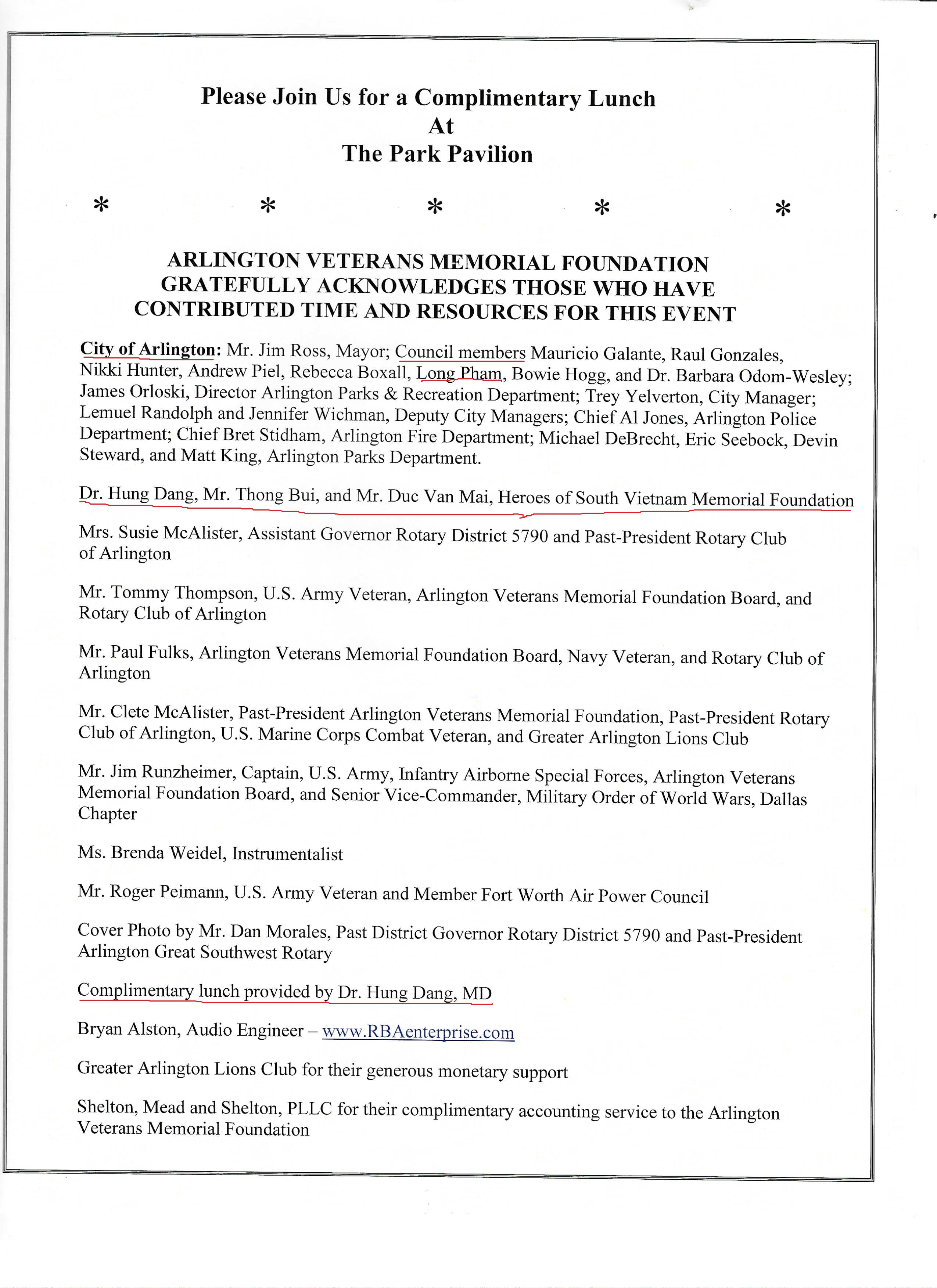 • 12:00 trưa - 1:00 chiều: Quan khách tham dự được mời bữa tiệc trưa MIỄN PHÍ với món thịt nướng kiểu Mỹ và ẩm thực Việt Nam tại Nhà Nghỉ Mát trong Arlington Veterans Park Memorial ngay sau lễ vinh danh.