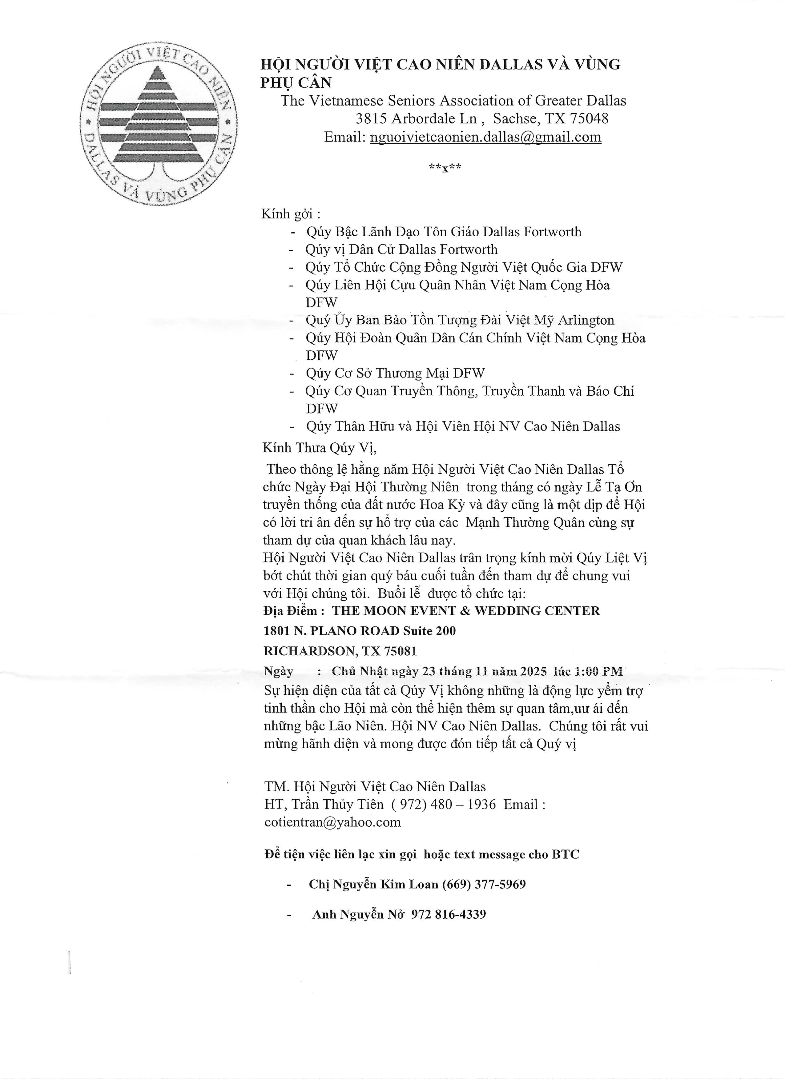 Thư Mời Hội Người Việt Cao Niên Dallas, Texas, USA & Vùng Phụ Cận