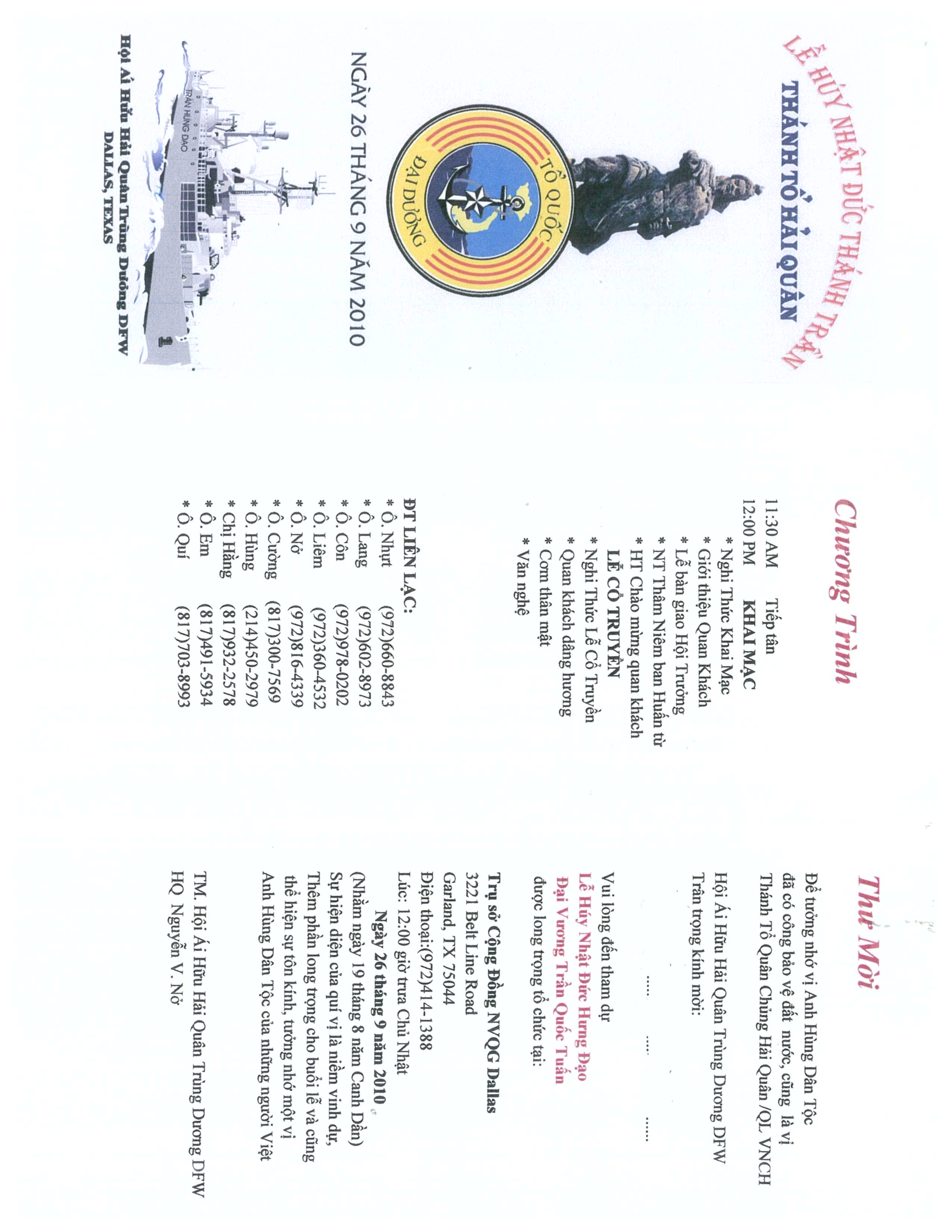 Chị Nhựt có nhờ chúng tôi email danh sách những qúi phu nhân và quí chiến hữu đã nhận nấu những món ăn cho ngày Giỗ Tổ Thánh Trần, ngày 26 tháng 9, 2010