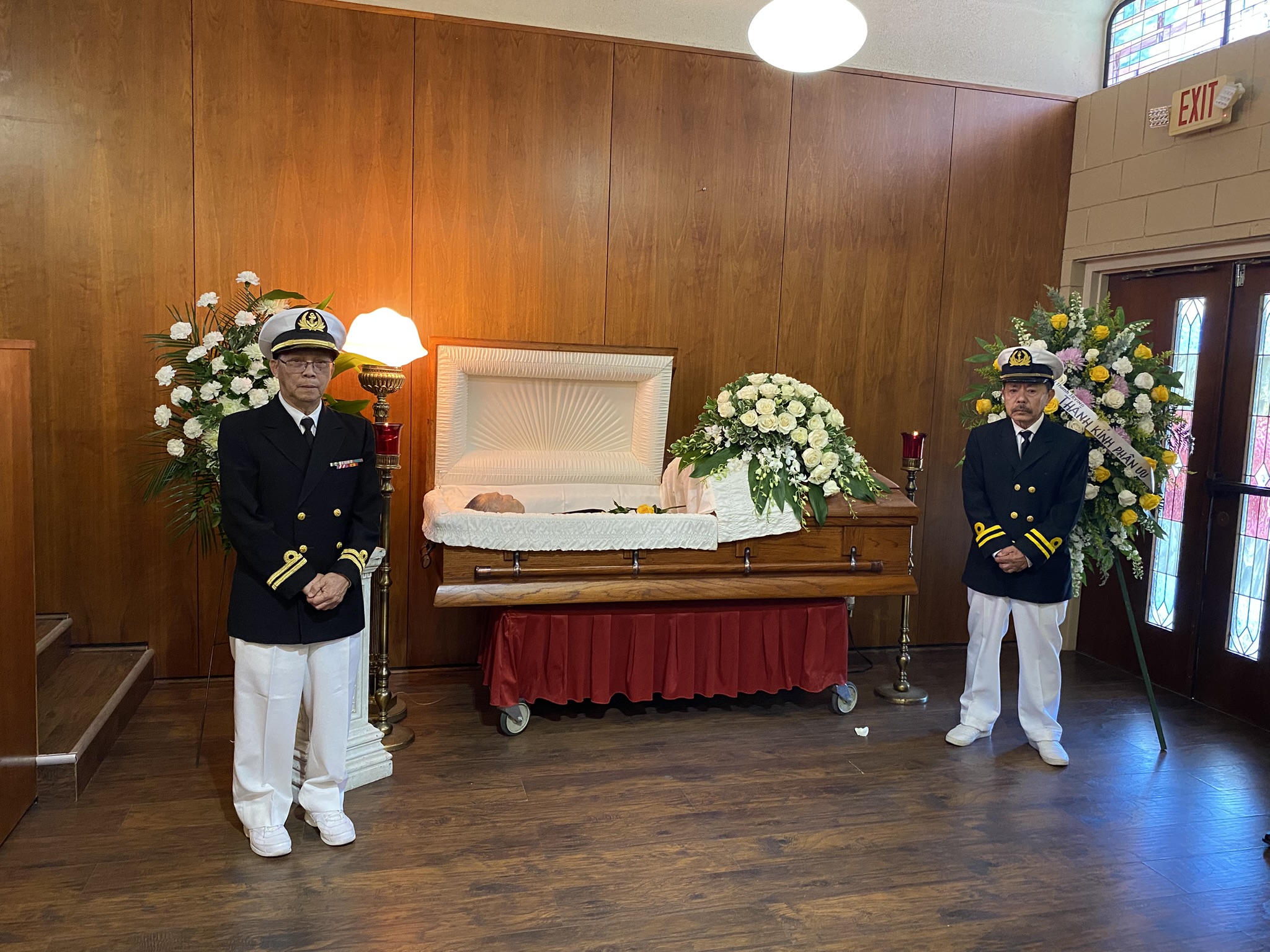 Chiến hữu Trần Văn Nhơn & chiến hữu Nguyễn Văn Lạc đứng hầu quan tài HQ Đại Úy Huỳnh Văn Vẽ {Khóa 17 Sĩ Quan Hải Quân Nha Trang, Đệ Nhị Hải Sư}