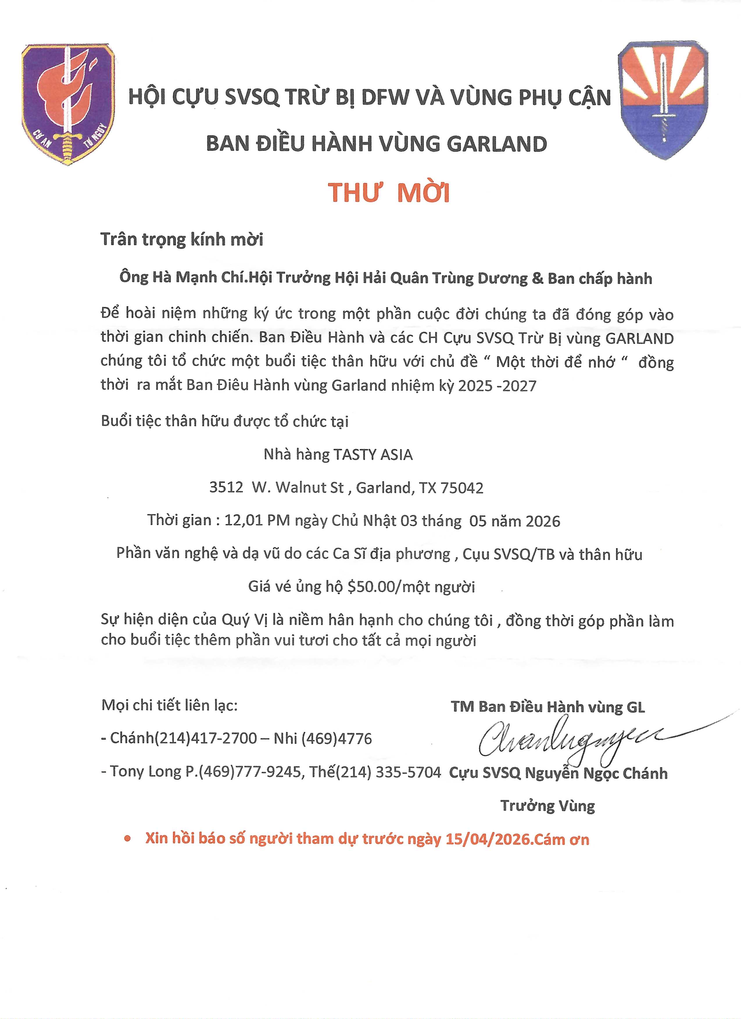 Kính gởi Ông Hội Trưởng Hà Mạnh Chí, và Ban Chấp Hành Hội Hải Quân Trùng Dương Dallas-Fort Worth (DFW)