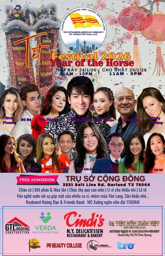 Hội Đồng Quản Trị Cộng Đồng Người Việt Quốc Gia Dallas trân trọng kính mời quý vị đến tham dự chương trình Mừng Xuân Bính Ngọ 2026. Đặc biệt, vào lúc 12:00 trưa Chủ Nhật ngày 1 tháng 2, sau nghi thức chào cờ, múa lân và đốt pháo, Ban Tổ Chức sẽ giới thiệu đại diện các cộng đồng bạn, các hội đoàn cùng quý vị khách mời danh dự để có đôi lời chúc Xuân gửi đến toàn thể đồng hương.