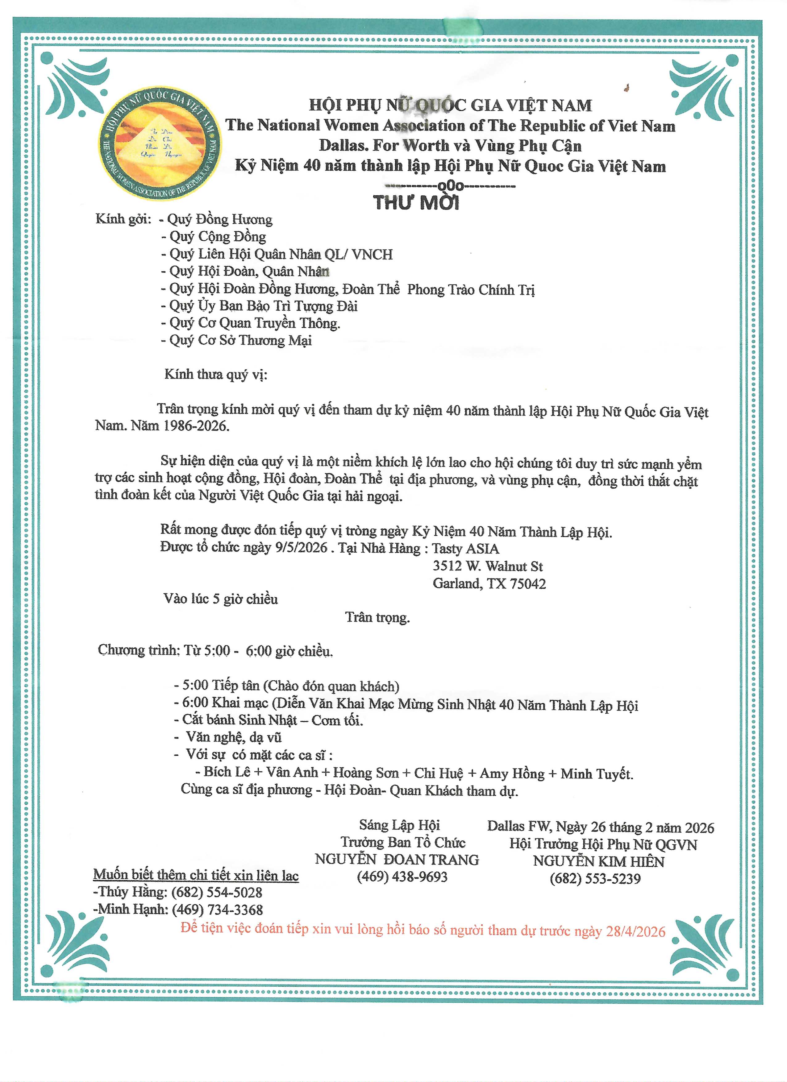 Thư mời tham dự Tiệc Xuân 2026 Hội Đồng Hương Quảng Ngãi Dallas-Fort Worth, Texas, USA